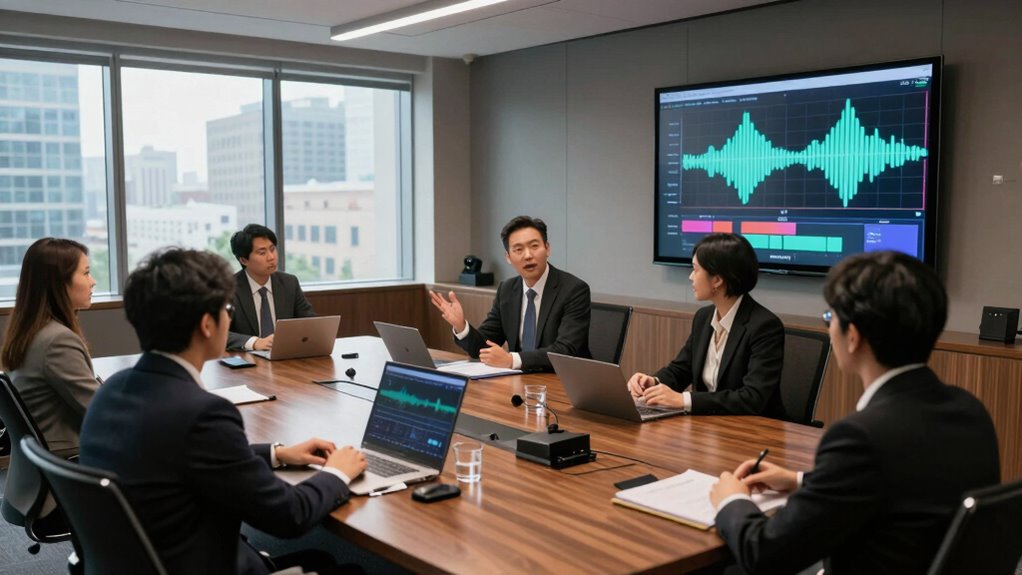 You can see beamforming speakers adjust to different room acoustics through automatic speaker calibration features. They analyze the room’s sound environment, identifying echoes and noise, then optimize their directional focus accordingly. This process guarantees clear audio by reducing feedback and background noise, even in challenging spaces. As a result, you experience consistent sound quality, regardless of room acoustics, making your meetings more effective and engaging.