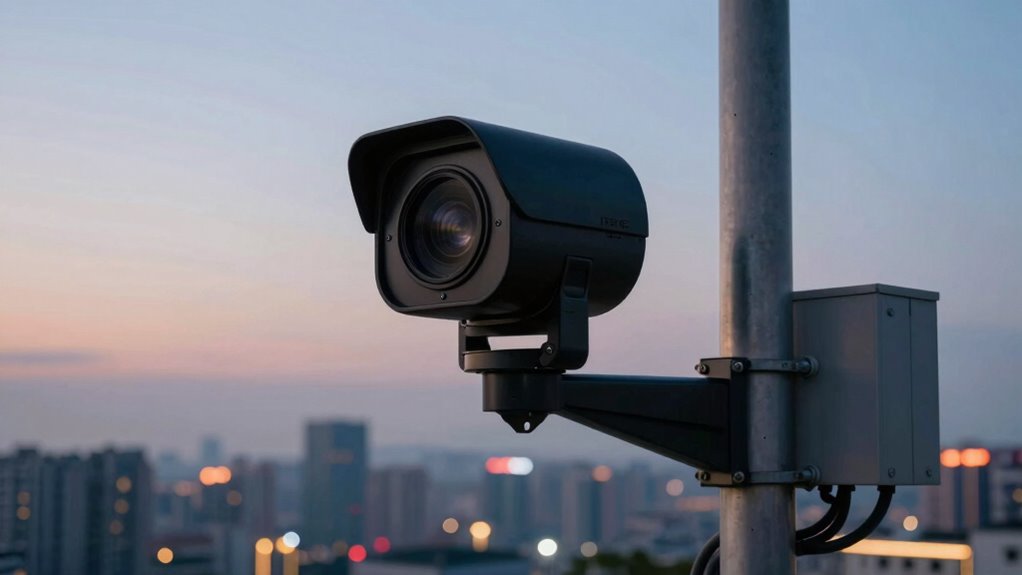PTZ cameras perform well in low-light conditions thanks to infrared illumination and night vision capabilities. You’ll notice clear images even in complete darkness because these features allow the camera to see beyond visible light. Infrared LEDs activate automatically when lighting dims, providing enhanced visibility without additional light sources. This guarantees your security remains effective around the clock, giving you peace of mind knowing your surveillance system adapts seamlessly to nighttime conditions.