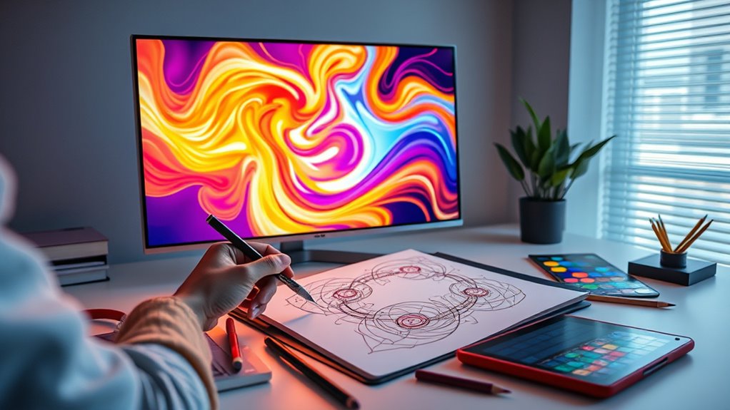 Using generative AI as a collaboration partner can substantially boost your creativity. It acts as a brainstorming teammate, offering new ideas, variations, and inspiration that expand your possibilities. AI tools help you refine your work through iterative feedback and quick adjustments, making your creative process more fluid and enjoyable. By combining your intuition with AI suggestions, you can develop skills and explore uncharted ideas. Keep exploring to discover how this partnership can transform your creative projects even further.