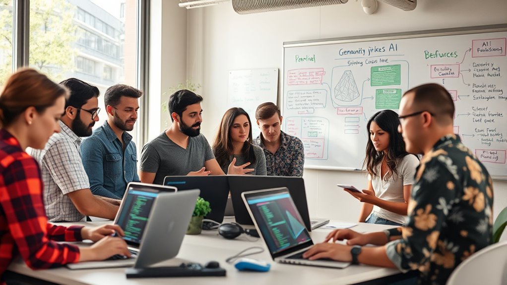 Open source generative AI drives community-driven innovation by giving you access to powerful, customizable models that everyone can improve and share. You can collaborate with a global network of developers, researchers, and enthusiasts, accelerating progress and fostering transparency. This openness helps identify biases, boost ethical standards, and incorporate the latest AI breakthroughs quickly. If you want to discover how this collective effort is shaping the future of AI, keep exploring these exciting developments.