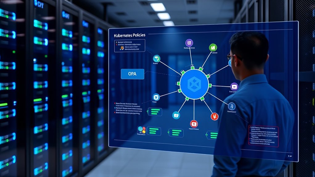 To manage policies in Kubernetes effectively, you can use OPA and Kyverno together. OPA evaluates requests in real time and enforces policies at admission, while Kyverno handles ongoing validation, mutation, and resource generation inside your cluster. This combo helps you guarantee security, compliance, and consistency even as your environment scales rapidly. Continuing this exploration will give you deeper insights into how these tools streamline your policy management and improve your cluster’s security posture.